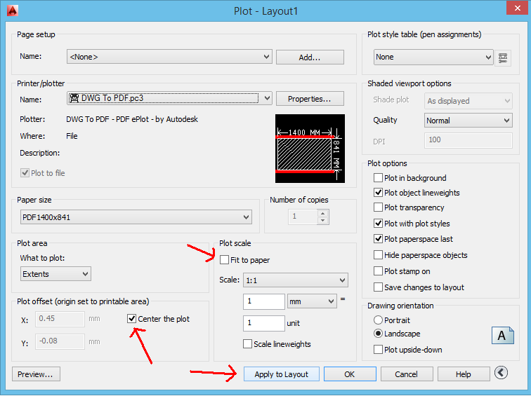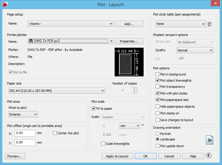 Klik vervogens op [Preview]. En het scherm opent zich waar op onderstaande te zien is. Zorg wel dat de plot scale en de drawing orientation goed staat aangevinkt.Anders even aanpassen. In dit geval hoeft je niet