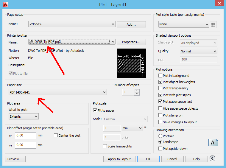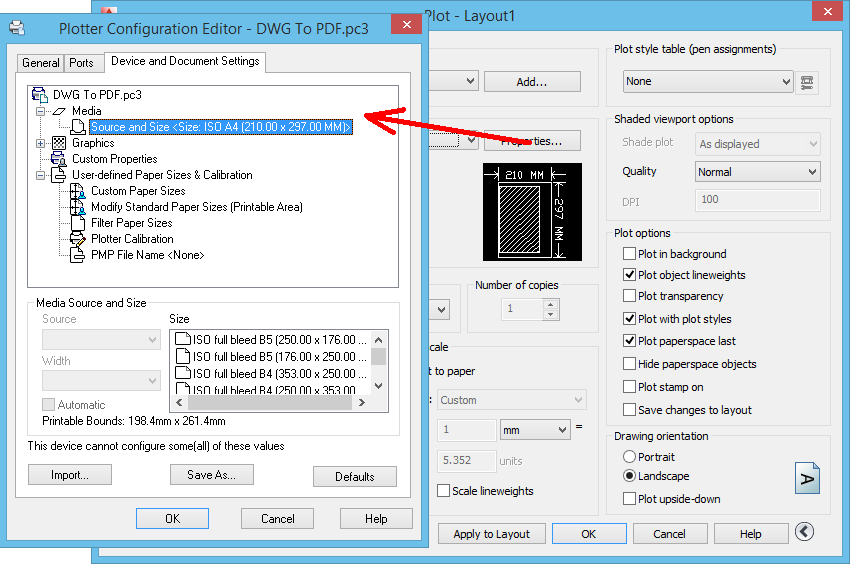 Zoals in het scherm te zien is heb ik al de PDF-plotter geselecteerd die standaard wordt meegeleverd in Autocad. Bij CutePDF werkt onderstaande niet. En het kan ook zijn dat bij sommige printers het niet werkt. Instellingen