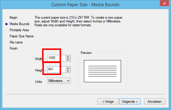 Vul bij Width het juiste formaat in in dit geval 1400 en bij Height 841. Het is dus niet verplicht om een formaat aan te maken dat werkelijk bestaat en wat kan worden afgedrukt op een printer. Je kunt een pdf ook gebruiken om iets te